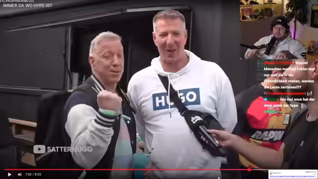 00:30:30Der Streamer beginnt mit den Reaktionen auf das neue 'Satter Hugo'-Video. Dabei unterhält er sich über das Thema 'Always There Where Hype Is' und die damit verbundenen Erwartungen an Streamer, die an Events teilnehmen. Anschließend zocken sie eine Runde Minecraft, die für den Streamer sehr frustrierend verläuft. Sein Teamkollege Revi fällt nach nur 30 Sekunden in ein Loch, woraufhin der Streamer wütend ist und seinen lang erwarteten Spielspaß ruiniert sieht. Er äußert seinen Unmut über die Performance.