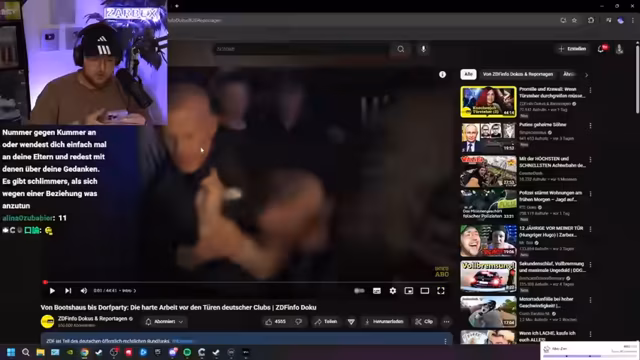 04:03:29Der Streamer zeigt einen Dokumentarfilm über die Arbeit von Türstehern im Club E3 und stellt die Anforderungen an diesen Job dar. Er spricht über die Kontrollen, den Andrang von Gästen und die mentalen Belastungen, wie z.B. der Umgang übermüdeter oder betrunken Personen. Gäste berichten über die Atmosphäre und die sozialen Aspekte des Clubbesuchs, während die Türsteher über die Notwendigkeit von Feingefühl und Durchsetzungskraft sprechen.