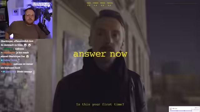 04:37:08Der Streamer und der Chat interagieren intensiv mit einem Berghain-Simulator. Dabei werden verschiedene Situationen durchgespielt, in denen der Nutzer versuchen muss, durch geschickte und teilweise unkonventionelle Antworten an den Portier Sven vorbeizukommen. Die Strategien reichen von Desinteresse über aggression bis hin zur Darstellung einer attraktiven, partywilligen Frau, was Julia tatsächlich zum Erfolg verhilft.