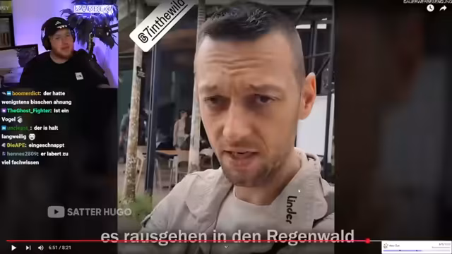 00:51:47Der Streamer Zarbex berichtet über einen intensiven Stream, bei dem er neun Stunden ohne Pause moderiert hat. Er und sein Kollege Schradin haben eine 24-Stunden-Überlebens-Challenge im Wald geplant, bei der sie ohne Essen, Trinken und Schlafplatz auskommen müssen. Sie müssen Feuer mit Feuerstein machen, Bäume fällen und durch einen See schwimmen. Zarbex erwähnt auch seine persönliche Situation mit seiner Freundin, die sich trennen möchte, um 'sich selbst zu finden', was emotional für ihn ist.