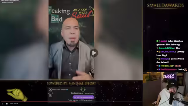 03:35:10Der Stream wird durch die Ankündigung und den Start der ersten Ausgabe der Small Deal Awards unterbrochen. Eine inoffizielle Award-Show, die vollständig von einem Mod organisiert wurde und vom Streamer als überraschend und positiv wahrgenommen wird. Toni, besser bekannt als Tobeni, moderiert die Show und präsentiert erste Kategorien wie "Bester Versprecher", bei der mehrere Clips des Streamers vorgestellt und analysiert werden. Die Atmosphäre ist entspannt und humorvoll, und es wird auf die hochgeladenen Clips für YouTube hingewiesen.