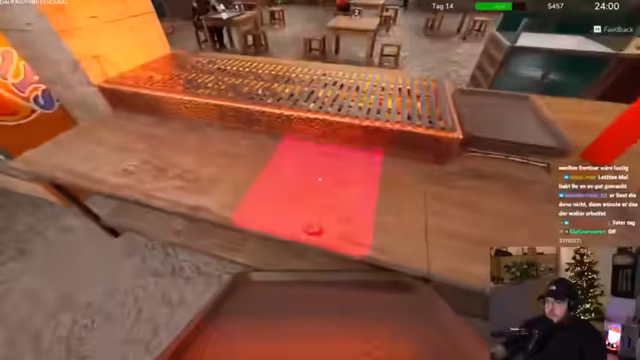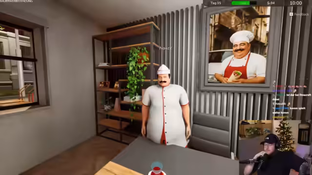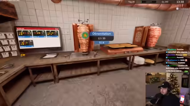 06:34:56Nach diversen Verzögerungen beginnt der eigentliche Gameplay-Teil mit dem Döner-Simulator. Der Streamer und sein Partner erleben einen chaotischen Start, bei dem es anfänglich Probleme mit der Organisation und der Bedienung gibt. Es kommt zu Missverständnissen bei den Bestellungen und aufgrund fehlender Zutaten wie Schablonenkäse werden mehrere Bestellungen falsch bearbeitet. Der Tag endet finanziell katastrophal mit minus 97 Dollar und einem Krisengespräch im Spiel, bei dem der Streamer seinem Partner eine kurze Freizeit lässt.