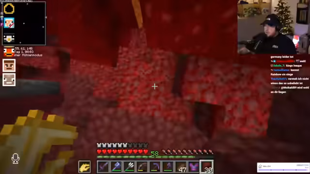 00:58:05Der Stream konzentriert sich auf das Farmen von Wither-Schädeln im Nether. Der Streamer erkundet eine optimale Stelle mit viel Soul Sand in der Nähe einer Bastion und einer Netherfestung, da die Spawnrate für Skelette dort höher ist. Der Prozess wird als anstrengend und aufwendig beschrieben, und der Streamer braucht Glück, um an die notwendigen Schädel zu gelangen. Das Ziel ist es, sechs Köpfe zu sammeln, um einen Beacon zu craften.