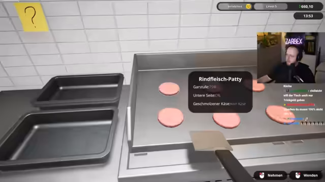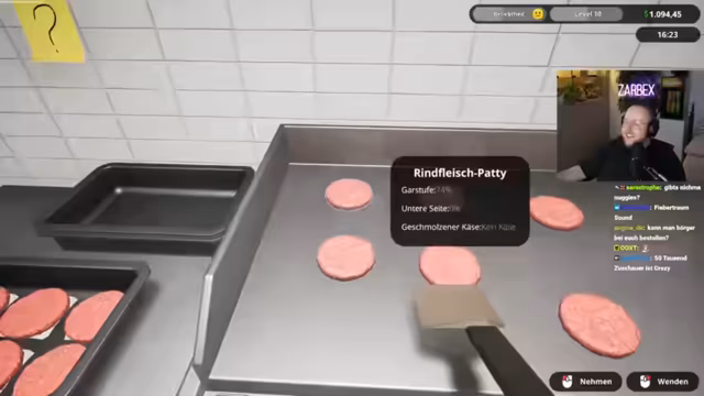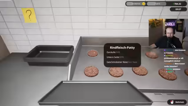 03:51:46Das Stream-Team beginnt seinen Tag im Fastfood-Simulator mit erheblichen organisatorischen Schwierigkeiten. Die erste Herausforderung ist das Finden der richtigen Zutaten und das Verständnis der Spielmechanik. Es kommt zu einem hektischen Suchen nach den Brötchen, den Patties und den Saucen, was zu frustrierten Kommentaren führt. Einer der Streamer übernimmt die Rolle des Kochen, während andere nach Zutaten suchen, was schnell zu einem unkoordinierten Durcheinander und verbrannten Burgern führt. Die ersten Kunden sind unzufrieden, da die Burger entweder trocken sind oder falsch zubereitet wurden.