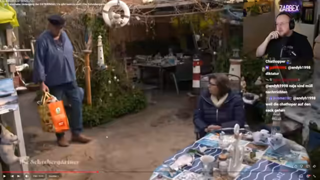 01:35:23Der Streamer erzählt von seinen positiven Kindheitserinnerungen an Ostern, geschmückte Häuser und die Suche nach Schoko-Ostereiern. Er kontrastiert dies mit dem Extremfall eines Schrebergärtners, der seine Parzelle übertrieben mit Ostereier-Dekorationen übersät hat. Diese Reizüberflutung empfindet er als extrem hässlich und wie aus einem Horrormovie, wo tote Haustiere im Dekorationswahn verscharrt werden. Er stellt die emotionale Bindung zu derartiger Dekoration in Frage.