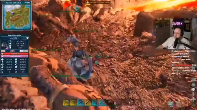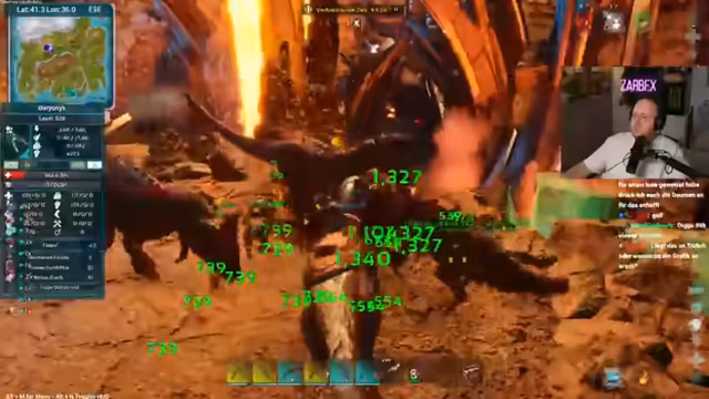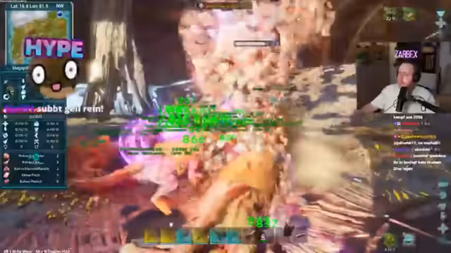 06:05:23Die Gruppe ist tief in der Höhle angelangt und steht nun vor dem Endboss, dem Overseer. Die Kreaturen wie Gigas und T-Rex greifen das Team an, was zu chaotischen Kampf-Situationen führt. Die Spieler kämpfen mit Steuerungsproblemen und Bugs während des Kampfes. Der Streamer ruft seine Mitspieler an, anzugreifen, während er selbst sich im Kampf wiederfindet.