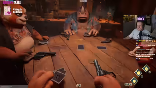 07:16:14Nach dem Ende von Arc Raiders wechselte der Stream zum Kartenspiel Queens Table. Es spielten der Streamer, Eli (Trimax), Mr. Geil und G-Time. Erklärtes Ziel ist, seine Karten loszuwerden oder andere beim Lügen zu ertappen. Das Spiel wurde mit dem Prinzip von Russisch Roulette kombiniert, bei dem jeder Spieler eine Waffe hat, deren Schusswahrscheinlichkeit mit jedem Versuch steigt. Für die Runde wurden spezielle Karten wie die schwarze Chaos-Karte und die Mastercard (Joker) vorgestellt.