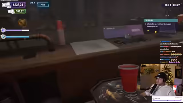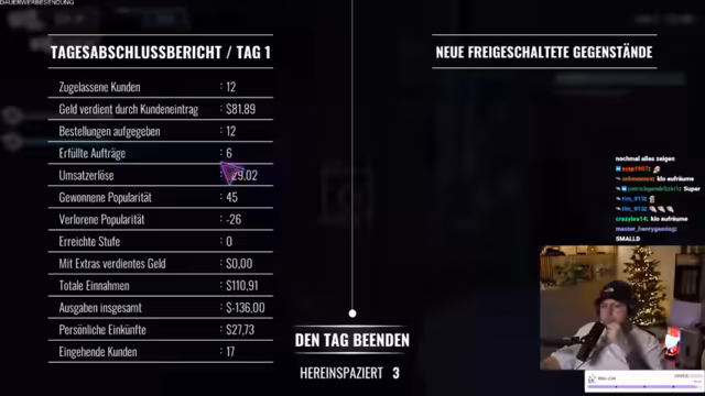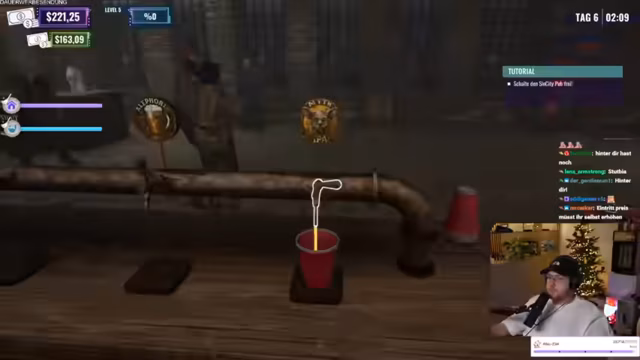 04:38:28Eine körperliche Auseinandersetzung ereignet sich, als ein betrunkener Kunde einen Mitarbeiter bedroht. Kollege Marcel schlägt daraufhin den Kunden nieder, was als negative Einflussnahme auf die Stimmung der Gäste kritisiert wird. Parallel dazu stößt der Streamer auf technische Barrieren: Ein Upgrade der Theke wird blockiert, was auf ein Problem mit einem Becher oder den Tablets zurückzuführen ist. Der Tag muss vorerst abgebrochen werden, um die Ursache zu beheben und die Getränke vor dem Despawnen zu retten.