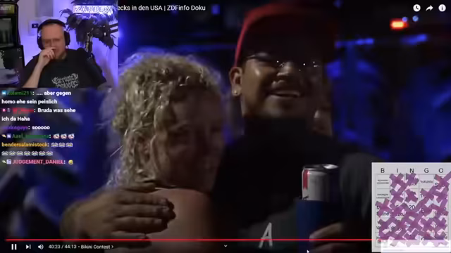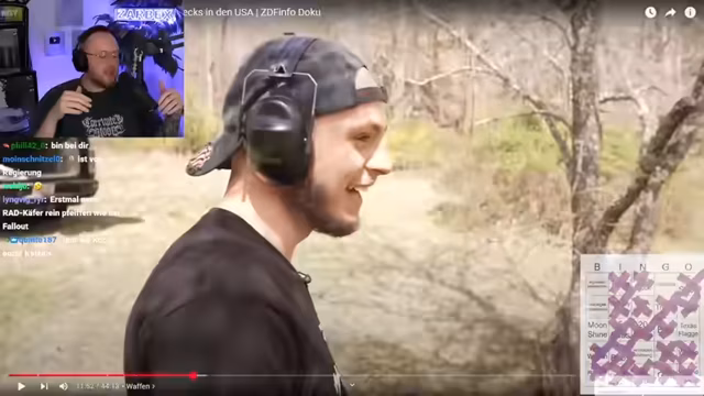 00:54:11Für Unterhaltung während des Streams wird ein Spiel namens Redneck-Bingo für die anschließende Doku 'Beten, Ballern, Trump' eingeführt. Der Streamer liest Begriffe wie 'Trump', 'Waffe', 'Grill' oder 'Vercrackte Wohnung' vor und die Zuschauer können im Chat mitmachen, wenn sie ein Feld auf ihrer Bingokarte sehen. Dieser interaktive Teil soll die Doku auflockern und einen gemeinsamen spaßigen Rahmen für das Zuschauervolk schaffen, bevor es in den eigentlichen Shopping-Stream übergeht.