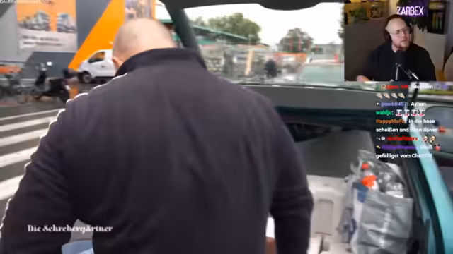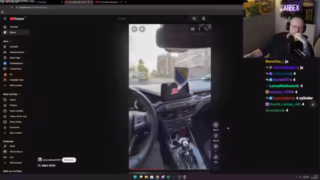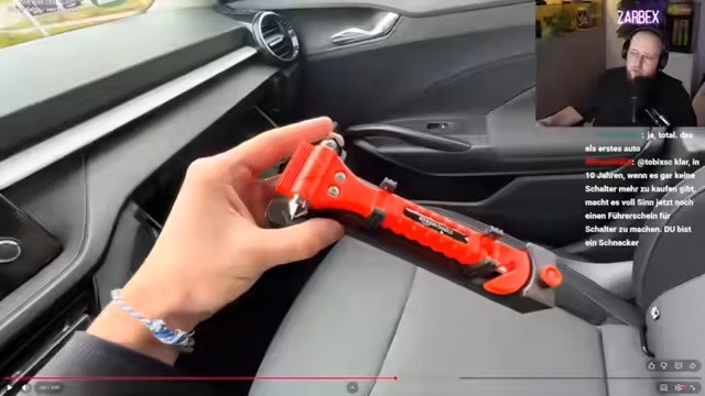 03:49:37Der Streamer wechselt zu einem selbst eingesendeten Video, das seinen VW Golf 5 zeigt. Dabei legt er besonderen Wert auf die humorvollen Eigenheiten des Autos. Das Lenkrad ist an einem Pappkarton befestigt und eine tote Ente, die sich stranguliert haben soll, dient als Glücksbringer. Des Weiteren erwähnt er eine LED-Streifenbeleuchtung und eine ungenutzte Aschenbecher-Schublade. Das Video verdeutlicht den selbstironischen und unperfekten Charakter des Fahrzeugs.