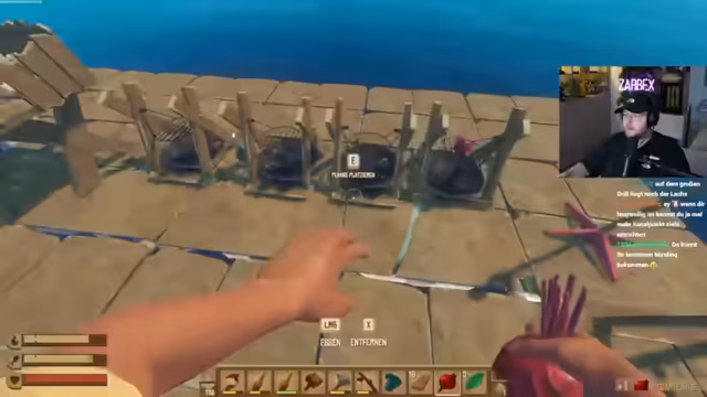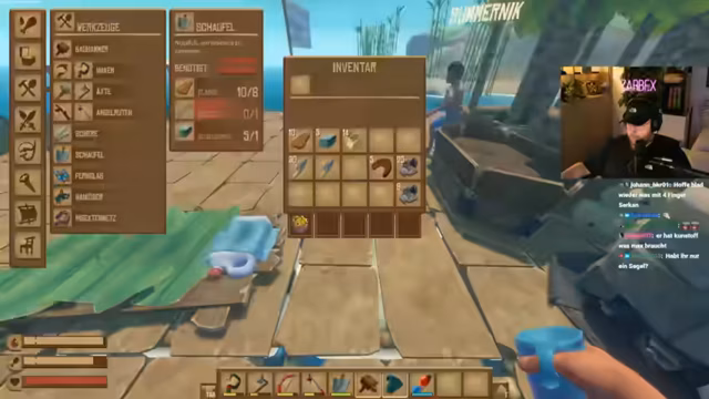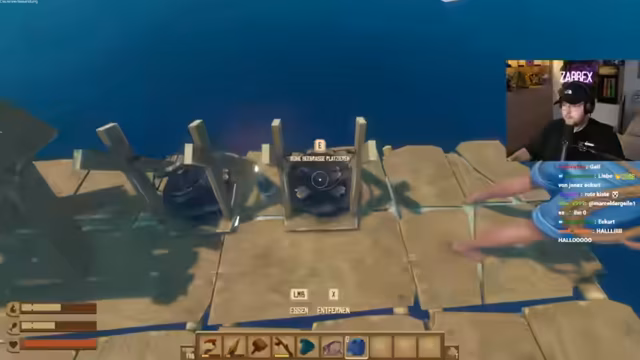 04:17:40Das Team konzentriert sich auf das Sammeln von Kupfer und der Verarbeitung von Ressourcen wie Holz und Seile, um die grundlegenden Überlebensstrukturen auf dem Floß aufrechtzuerhalten. Ein Fokus liegt auf der Herstellung von Angelruten, um Nahrung zu beschaffen, und das Craften von Sammelnetzen, um Rohstoffe wie Seetang effizienter zu sammeln. Der Chat wird um Unterstützung bei der Beschaffung von Planken und Seilen gebeten, da diese für den Fortschritt im Spiel unerlässlich sind.