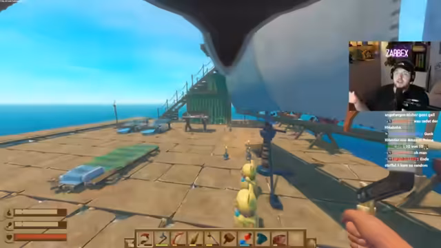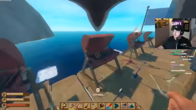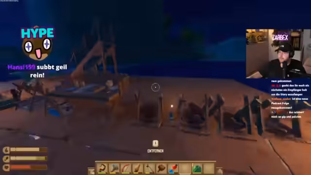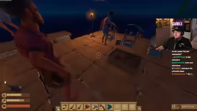 06:40:07Das Team trifft auf technische Herausforderungen im Spiel, wie bei den Fischernetzen, und kämpft mit der Mechanik des Fischfangs. Ein Spieler stößt bei seinen Aktivitäten auf Unverständnis im Chat, fühlt sich jedoch im Team unterm Strich bestätigt. Es folgen weitere Farm-Exkursionen zur Beschaffung von Holz und Schrott. Gleichzeitig wird über die Fortschritte in der Raft-Welt gesprochen, wobei der wachsende Fortschritt bei der Basisentwicklung, insbesondere der Nahrungsproduktion, gelobt wird.