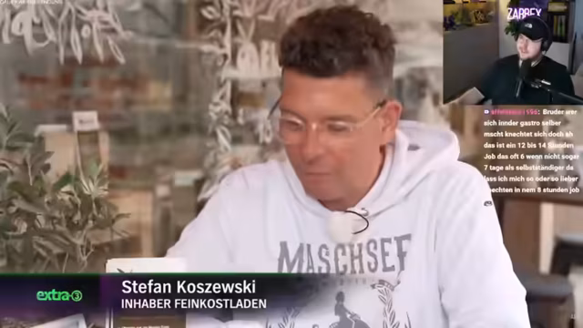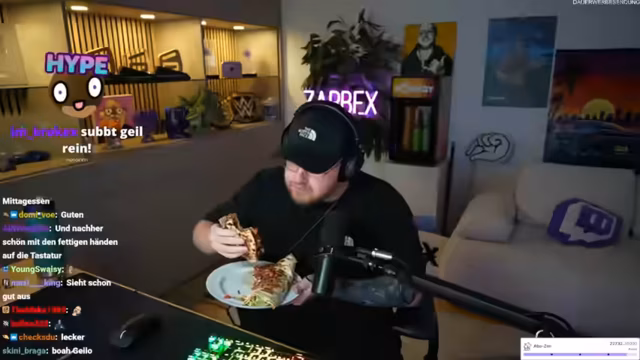 00:54:56Während der Reaktion auf ein Video von 'Satter Hugo' kam das Thema Gastro XXL auf, eine Marke für XXL-Portionen von Fast Food wie Riesenburger. Dies führte zu einem humorvollen Disput über Latzhosen und deren Funktionalität, wobei der Streamer eine Öffnung für die Notdurft vermisste. Dies mündete in ein allgemeines Gespräch über verschiedene Essensformate und Restaurantbesuche, wobei er seine Vorliebe für große Portionen und geiles Essen betonte und hierfür zukünftige Kooperationen andeutete.