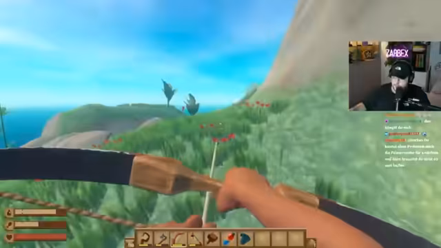 05:29:25Die Crew beginnt, die Insel zu erkunden, und stößt auf verschiedene Tiere wie ein aggressives Wildschwein und einen Adler, die angreifen. Das Wildschwein wird erfolgreich erlegt und liefert Fleisch und Leder. Der Adler stellt eine größere Herausforderung dar, erfordert mehrere Treffer mit dem Bogen und wird schließlich nach einem intensiven Kampf besiegt. Dabei werden geflügelte Schenkel und Federn als Beute gedroppt.