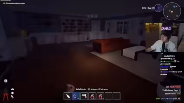 02:31:33Die Streamer erkannten, dass sie durch das Töten von Gegnern weniger Geld erzielen als durch das unbewaffnete Betäuben und Fesseln. Daher beschlossen sie, sparsam mit der Munition umzugehen. Es wurden Betäubungspfeile und Kabelbinder besorgt, um die Zielleute ruhigzustellen und anschließend ungestört die Häuser leerzuräumen. Fokus lag auf dem Diebstahl von wertvollen VIP-Gegenständen, um schnell Credits zu sammeln und sich endlich eine Waffe leisten zu können.