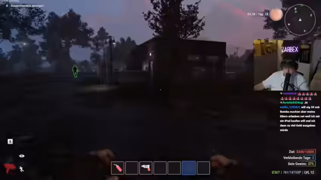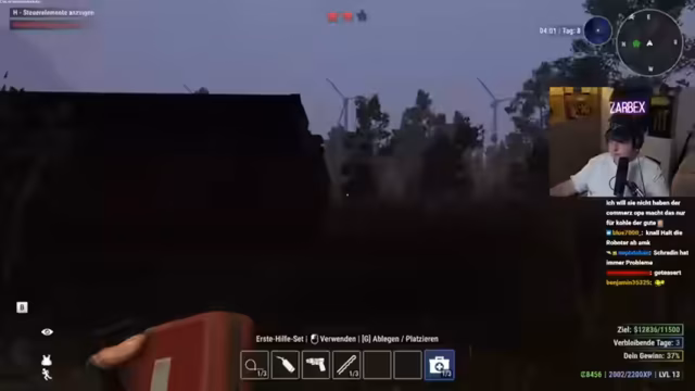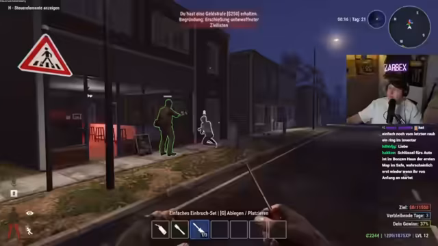 03:46:08Eine harmlose Beutesammlung in einer Reihe von Reihenhäusern endet abrupt, als ein Polizist die Gruppe entdeckt. Es folgt eine angespannte Verfolgungsjagd, bei der der Streamer den Polizisten ablenkt, während Schradin sich aus dem Gefahrenbereich zurückzieht. Die Situation wird dadurch entschärft, dass der Polizist sich für die tote Person im Haus nicht interessiert. Der darauffolgende Rückzug und die strategische Nutzung von Verstecken demonstrieren die gelernte Vorgehensweise in kritischen Spielsituationen.