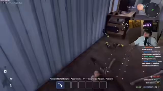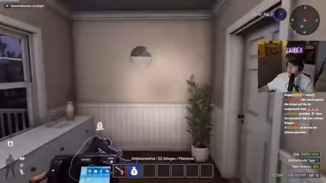 03:00:37Der Streamer und sein Begleiter, Schradin, durchsuchen eine Villa auf der Suche nach Wertgegenständen. Sie stoßen auf diverse kleine Beutestücke wie Ringe und eine goldene Karte, die Boni freischalten, sind jedoch enttäuscht über das geringe Angebot an wirklich wertvollen Dingen wie Tresoren. Bei der Suche werden Bewohner des Hauses gefesselt gefunden, die bei weiterer Gewaltanwendung zusätzliche Gegenstände fallen lassen. Die anfängliche Suche gestaltet sich frustrierend, da die beutearme Beute und die Struktur des Haumes nicht den Erwartungen entsprechen.