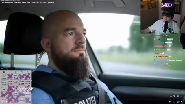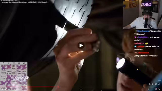00:48:41Nach den technischen und emotionalen Vorfällen wechselt der Stream zu seinem Hauptformat: 'Speedcops' mit Bingo-Spielmechanik. Der Streamer erläutert kurz die Regeln: Unter dem Publikum werden Wetten auf das Auftreten von spezifischen Ereignissen in den Polizeivideos abgeschlossen. Eine Folge der Serie 'Speedcops' wird gestartet, in der Polizisten in Neumünster Verkehrsverstöße kontrollieren. Ein VW-Bus mit Tuning wird in das Visier der Beamten genommen und die Begründung für die Kontrolle, inklusive illegal getönter Scheiben, wird erörtert. Der Stream endet mit dem Beginn einer Kontrolle.