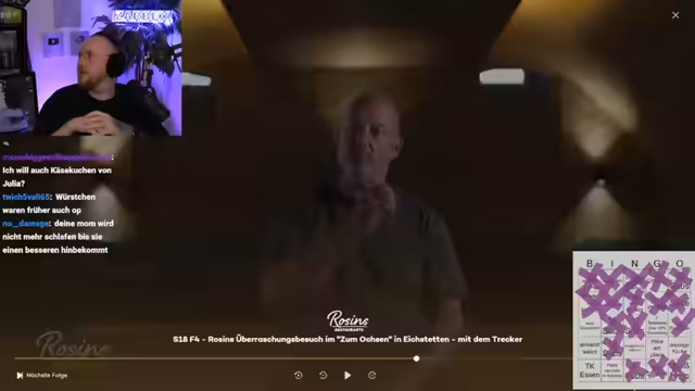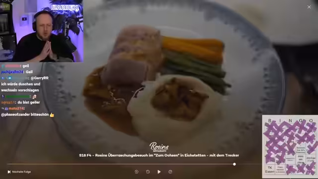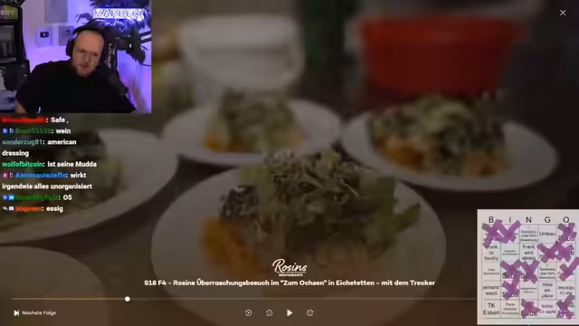 03:27:32Nach einer kurzen Pause wegen eines technischen Unterbrechungen geht der Stream in eine neue Folge der Dokumentationsserie 'Rosins Restaurants'. Der Streamer präsentiert den Fall des Gasthauses 'Zum Ochsen' in Eichstetten, das von einem Quereinsteiger-Paar betrieben wird. Er kündigt das traditionelle 'Bingo'-Spiel an, bei dem das Publikum die typischen Probleme der Serie vorherschen soll.