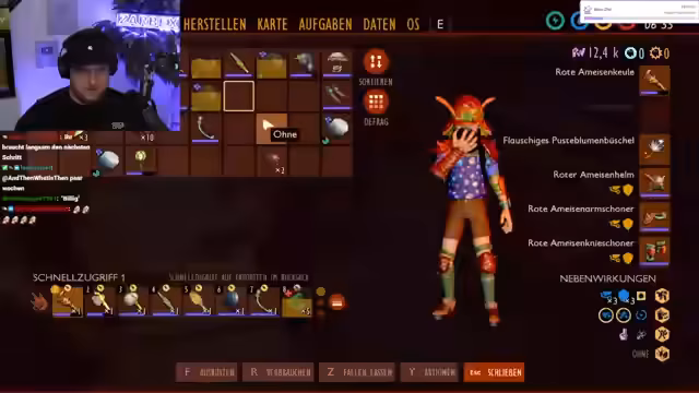 01:08:53Zarbex macht Fortschritte und fragt Schradin, ob er mit in den Ameisenbau kommen möchte. Sie stellen fest, dass sie eine Fackel benötigen, und Zarbex räumt sein Inventar auf. Der Chat schlägt vor, eine komplette Ameisenrüstung zu craften, da die Ameisen die Spieler dann nicht angreifen würden. Zarbex beginnt, die Rüstung zu craften. Er ist sich sicher, dass sie alle Ameisen besiegen werden. Zarbex ist beim Baseballplatz angekommen und sucht nach dem Ameisenbau. Er analysiert Madenfleisch und Madenhaut. Schradin lobt Zarbex für seine Leistung. Zarbex droppt Teile der Rüstung für Schradin. Sie kommen dem Ameisenbau näher und Zarbex craftet die restliche Rüstung.