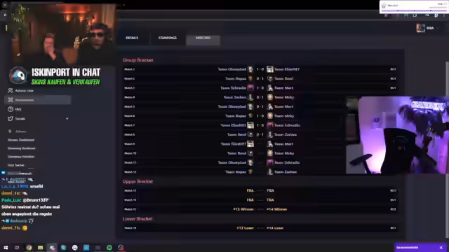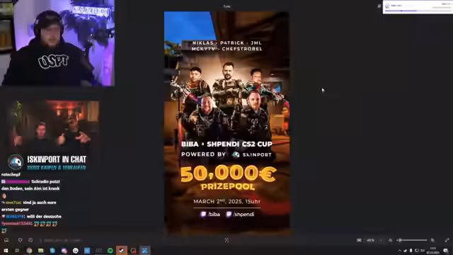 01:45:22In drei Minuten startet das 50.000 Euro Counter-Strike-Turnier. Der Streamer fragt im Discord nach, wo man den Stream gucken kann. Er ist nervös, da es um viel Kohle geht. Er will sich im Deathmatch einspielen. Er braucht Kisten zum Öffnen. Er muss auf jeden Fall gleich noch mal scheißen während die ersten spielen. Er macht ein halbes Studium, um eine Kiste zu öffnen. Er fragt, welche Kisten er öffnen soll und wie lange er nach dem ersten Tab warten muss, bis die AK wieder 100% präzise ist. Er hat schon einen Knife unboxed. Es wird langsam besser mit den Headshots. Er ist der schlechteste Spieler aus dem Team. Er kümmert sich um die wichtigen Sachen, um die kleine Warm-Up. Er öffnet ein paar Boxen. Er braucht auch welche. Die Schlüsse kostet nur 3 Euro pro Box. Er macht eine Breakout auf. Er schickt im Discord die Übersicht über die Match-Ups. Team ohne Pixel gegen Team Eli, Team Reapers gegen Team Rewi, Team Schradin gegen Team Mert. Sie sind gegen Team Miki. Er fragt, ob ohne Pixel ein krasser Spieler ist. Er will auch Kissen aufmachen. Er macht keine auf. Er entschulde gerade den Free-Content bei Nico.