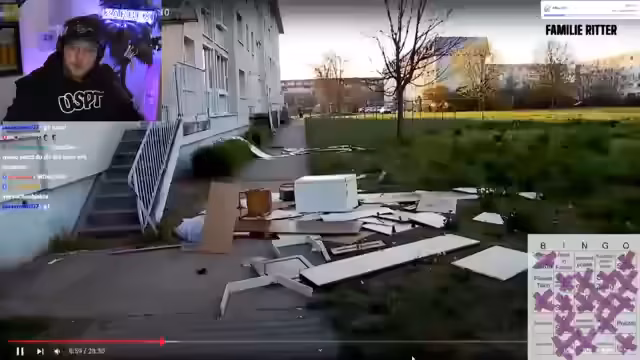 00:35:34Der Streamer startet das angekündigte Ritter-Bingo und stimmt den Chat auf die kommende Sendung ein. Er erklärt die Regeln, wonach Intro und Rückblick nicht für das Bingo zählen. Es wird eine Wette gestartet, ob acht oder mehr Bingos erreicht werden. Der Streamer reagiert auf die Szenen in der Ritter-Sendung, kommentiert den Zustand der Wohnung und das Verhalten der Protagonisten. Er äußert sein Mitgefühl für die Tiere, die in dem Dreckloch leben müssen. Er kritisiert die fehlende Selbstreflexion von Karin Ritter, die die Schuld für ihre Situation stets bei anderen sucht. Der Streamer kommentiert die gelben Wände, die durch das Rauchen entstanden sind, und scherzt, dass man aus dem Teer die Autobahn neu pflastern könnte. Er entdeckt ein Foto seines Freundes Sascha und äußert sich anerkennend über dessen Attraktivität. Der Streamer spricht über seinen bevorstehenden Umzug mit Julia und die damit verbundene Notwendigkeit, sich von alten Sachen zu trennen.