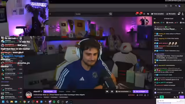 03:20:57Die Quizshow beginnt mit verschiedenen Spielmodi wie 'Buzzer Games'. Die Teams sind zusammengesetzt: Rehpatz mit Zabex, Edi Jello mit Danny und Willi mit Kroko. Der Streamer zeigt sich aufgrund des Supports in guter Stimmung und ist sogar bereit, 30 Subs als Preis für das Gewinnerteam zu spenden. Die Quizrunde startet mit Bilderrätseln und humorvollen Kommentaren der Teilnehmer.