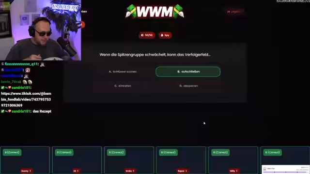 04:53:06Während des Quizspiels entwickelt sich eine dynamische Interaktion zwischen den Spielern. Reaper wird dafür kritisiert, seinen eigenen Mate zu erdeutschen, während Danny für seine Spielweise gelobt wird. Die Teilnehmer geben sich gegenseitig Spitznamen und machen sich über ihre Entscheidungen lustig. Streamer mischt sich ein und kommentiert die Ereignisse mit humorvollen Bemerkungen über das Verhalten der Spieler. Das Spiel wird durch gegenseitiges Provozieren und Unterstützung aufgelockert.