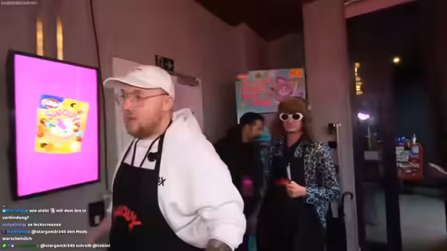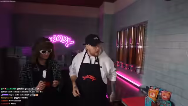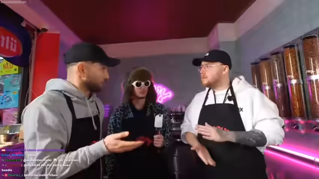 00:47:07Am Praktikumsort angekommen, wird der Streamer herzlich begrüßt. Die Location ist professionell aufgebaut, und es sind bereits einige Fans anwesend. Er erhält ein XXL-Kondom als Geschenk und scherzt über die Größe. Anschließend wird ihm eine Schürze überreicht, und er bekommt seine Aufgaben für den Tag: Salted Caramel ziehen, Erdnüsse schokolieren und Swayvi-Tüten füllen. Er betont, dass er als Streamer noch nie "richtig gearbeitet" hat und bittet um Anleitung und eine ehrliche Bewertung seiner Leistung. Die Aufgaben müssen in zwei Stunden erledigt werden, was er als "sportlich" empfindet, aber er ist motiviert, sein Bestes zu geben. Ein Praktikant für den Praktikanten ist ebenfalls anwesend, was für weitere Lacher sorgt.