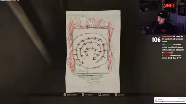 04:19:59Der Streamer bekommt Gänsehaut und fühlt sich unwohl. Er findet ein Foto mit einer 2 und erinnert sich an einen Schlüssel. Er vermutet, dass er damit einen Kleiderschrank öffnen kann. Er bekommt Paranoia und will den Raum verlassen. Er macht das Licht wieder an und hat Panik. Er schwitzt stark und findet TikTok-Hinweise. Er weiß immer noch nicht, was er mit dem Steinbrikett machen soll. Er findet eine Kombination: 3L, 12R. Er vermutet, dass dies die Kombination für den Safe ist. Er verläuft sich und sucht das Zimmer des alten Mannes. Plötzlich schließt sich das Spiel und er hat Angst, alles verloren zu haben. Er versucht, das Spiel wieder zu öffnen und die Kombination für den Safe einzugeben. Er hat keine Ahnung, wie er es geschafft hat, aber der Safe öffnet sich.