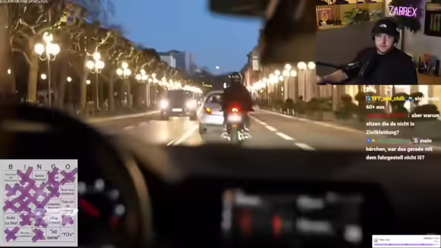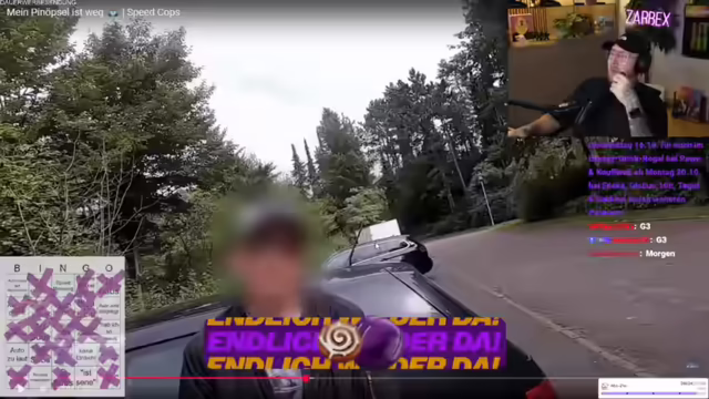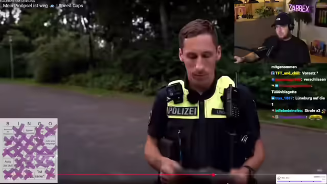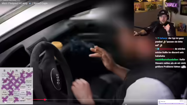 03:27:12Der Streamer gönnt sich ein Stück Pizza und reflektiert über die Nachwirkungen einer durchzechten Nacht, die ihn körperlich mit Kopfschmerzen und einem aufgequollenen Gefühl zurückgelassen hat. Anschließend wird ein 'Speedcops-Bingo' gestartet, bei dem die Zuschauer durch Subscriptions Felder auf einer Bingo-Karte aktivieren können. Die Regeln des Bingos werden erklärt, wobei verschiedene Ereignisse wie 'Blaulicht', 'Auto zu laut' oder 'Auto getunt' zum Gewinn führen können. Es wird eine Folge von 'Speedcops' gezeigt, in der die Polizei Motorradfahrer und getunte Autos kontrolliert. Die Beamten achten auf unnötigen Lärm, nicht eingetragene Teile und tiefergelegte Fahrzeuge. Es kommt zu einer Kontrolle eines Audi-Fahrers aus der Schweiz, dessen Fahrwerk als zu tief erachtet wird. Die Polizisten nutzen Spezialausrüstung, um die Tieferlegung zu überprüfen, da der Verdacht besteht, dass die Feder nicht eingetragen ist und eine Gefahr darstellen könnte. Die Weiterfahrt wird untersagt, bis das Problem behoben ist, was kurz vor einem Tuning-Treffen als besonders ärgerlich empfunden wird.