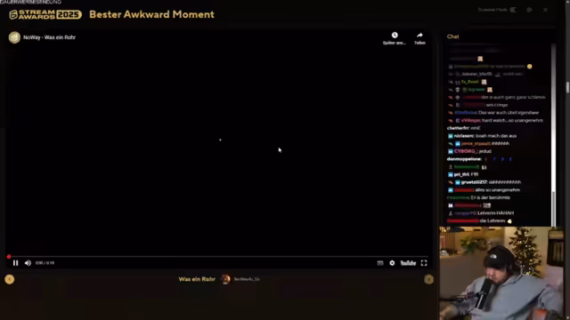 02:42:24Die Kategorie „Bester Awkward Moment“ wird vorgestellt, in der Clips gesammelt werden, die für Gänsehaut sorgen. Nominiert sind Kunschi Kitty, Skyline TV, Jenyan und Baso, Rumatra, Rohat, Honeypoo, Alexis Pizmied, Papaplatte Rees und No Way. Ein Clip wird gezeigt, in dem eine Frau zu einem Streamer sagt: „Wir verdienen wahrscheinlich mehr als du.“ Der Streamer ist entsetzt über die Verbitterung und den Hass, den manche Menschen in sich tragen, um solche Aussagen zu tätigen, insbesondere vor dem Kind des Streamers. Er kritisiert, wie man so herablassend sein kann, als wären Streamer „gesellschaftlicher Schmutz“, obwohl sie wahrscheinlich mehr Steuern zahlen als die Kritiker in zehn Jahren. Er lobt die Streamerin im Clip dafür, wie locker sie die Situation handhabt und den „Drive-By“ einfach auseinandernimmt, während der Kritiker sich selbst „zum Obst der Woche“ macht. Dies wird als „geisteskrank“ und „igitt“ beschrieben.