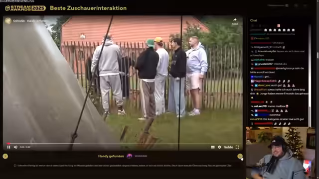 02:50:36In der Kategorie "Beste Zuschauerinteraktion" wurden mehrere Streamer wie Cast Crafter, Johnsman, Monte, Hamid Loco, Schradin und Hand of Blood nominiert. Der Streamer äußerte sich überrascht, dass Schradins Handyclip, bei dem ein Zuschauer sein im Teich verlorenes Handy rettete und zurückbrachte, so unterbewertet war. Dieser Vorfall, bei dem ein Zuschauer extra tauchte, um das Handy zu bergen, wurde als eine unglaublich krasse und vertrauensbildende Aktion hervorgehoben. Der Streamer betonte die Ehrlichkeit des Zuschauers, der das Handy zurückbrachte, und hob hervor, wie sehr diese Geste das Vertrauen in die Menschheit wiederherstellte. Trotz der vielen guten Clips votierte der Streamer für Schradin, da die Aktion des Zuschauers, drei Meter tief zu tauchen und das Handy zurückzubringen, als außergewöhnlich empfunden wurde.