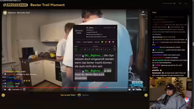 03:11:06Die Kategorie "Bester Troll-Moment" umfasste Clips wie "Wo ist die Tüte?" von Pete Smith und den "Trimax-Raid". Ein besonders hervorstechender Troll-Moment war, als Cars Crafter auf einen alten Witz hereinfiel, was der Streamer als "krank" und "auf den ältesten Witz reingefallen" bezeichnete. Ein weiterer Clip zeigte eine Streamerin, die während eines "Trimax-Raids" mit vielen Zuschauern überrascht wurde. Der Streamer kritisierte erneut die Clip-Auswahl dieses Jahres und betonte, dass viele gute Clips, auch von anderen Streamern wie Trimax, nicht berücksichtigt wurden. Er hob hervor, dass er seine Meinung als Streamer äußern müsse, auch wenn dies als "selbstverliebt" oder "unsympathisch" wahrgenommen werden könnte, da er die Qualität der Auswahl als nicht ausreichend empfand, obwohl er die Mühe der Organisatoren schätzte.