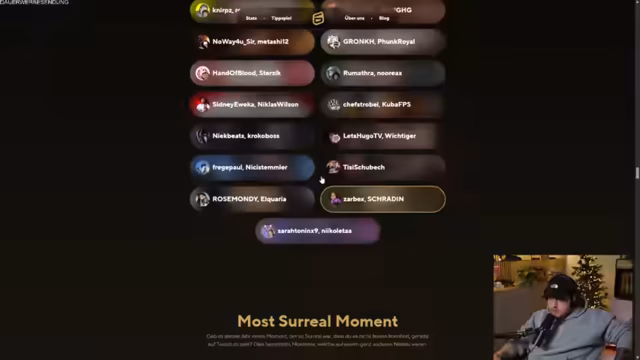 02:12:47In der Kategorie „Bester Gaming-Moment“ werden Clips von Mali, Bonschwa, Baso, Gronkh, Eli, Rose, Sydney, Musti, Mango und Trilux gezeigt. Ein Clip von Mali, der eine eigene Cantina-Band bucht, wenn er ein Tor schießt, wird als „stark“ und „geil“ bewertet. Der Streamer äußert Enttäuschung, dass keine eigenen Clips von ihm und Schraddi, insbesondere von ihrem „The Forest“-Projekt, nominiert wurden, obwohl sie dieses Jahr viel gemacht haben. Er findet die Auswahl der Gaming-Momente schwierig und ist der Meinung, dass es im gesamten Jahr 2025 sicherlich krassere Momente von vielen Streamern gab, wie zum Beispiel Schradins Eldenring-Projekt. Er betont, dass seine Kritik nicht böse gemeint ist, sondern seine ehrliche Meinung widerspiegelt. Er bezeichnet die Kategorie „Gaming-Moment“ als „tote Kategorie“ dieses Jahr und entscheidet sich letztendlich für Malis Clip mit der Mariachi-Band, da er diesen am witzigsten findet, obwohl Gronkhs „Kohle-Kohle-Kohle-Song“ auch Legenden-Status hat.