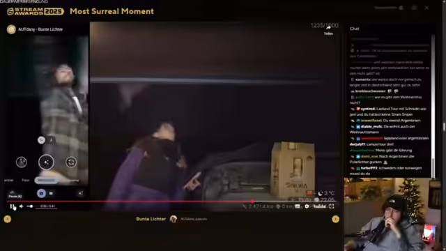 03:30:32Die Kategorie "Most Surreal Moment" zeigte Clips wie "Magie von Skyline" und "Electric Callboy-Überraschung". Ein Magiertrick mit einer fallenden Karte, die durch ein Fenster fiel, wurde als "krass" und "geil gemacht" bewundert, auch wenn der Mechanismus dahinter (ein Magnet) entschlüsselt wurde. Der Streamer sprach über die Dualität, Magie genießen zu wollen, aber gleichzeitig wissen zu wollen, wie sie funktioniert. Ein weiterer surrealer Moment waren die Polarlichter, die im Stream gezeigt wurden. Der Streamer äußerte den Wunsch, diese einmal live in Lappland zu sehen, da er dies als ein "geiles Naturphänomen" und ein "geisteskrank geiles" Erlebnis empfand. Er votierte für die Polarlichter, da er es "echt geil fand, dass die das so einfach im Stream auf Kamera hatten".