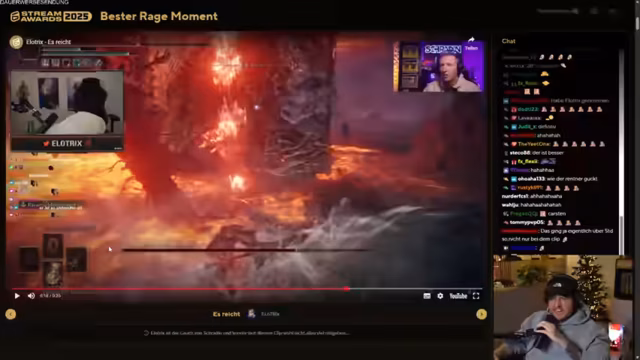 02:01:37Der Streamer bedauert, die Formel 1-Ära von Eli verpasst zu haben, da er zu dieser Zeit mit einem Umzug beschäftigt war und daher nicht an den gemeinsamen Streams teilnehmen konnte. Er hofft, nächstes Jahr dabei zu sein, da es sehr lustig aussah. Anschließend werden die Stream Award-Nominierungen besprochen. In der Kategorie „Bester Rage Moment“ entscheidet sich der Streamer für Elotrix, da dessen Wutausbruch sehr authentisch und nachvollziehbar ist, obwohl Kroko auch knapp dahinter liegt. Er ist jedoch enttäuscht, dass ein eigener legendärer Clip vom „Wildstream“, bei dem Schradin ihn versehentlich mit einem Stock traf, nicht nominiert wurde, obwohl er in der Vorauswahl war. Dies wird als „Bruch“ empfunden, aber er gönnt Elotrix den Award, falls dieser gewinnt.