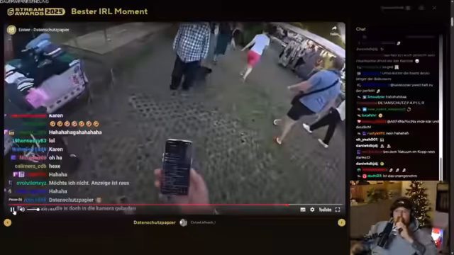 02:08:12Der Streamer kommentiert einen „unangenehmen Clip“ über eine „Karen“ auf einem Flohmarkt, die sich über das Filmen beschwert. Er bezeichnet dies als seinen „schlimmsten Albtraum“ und erklärt, dass Flohmärkte der „Spawnpunkt für Karens“ sind, weshalb er dort nie wieder streamen würde. Er kritisiert, dass solche Personen durch ihr Verhalten, vor die Kamera zu springen und zu schreien, erst viral gehen und sich selbst in Schwierigkeiten bringen. Die Frau im Clip fordert wiederholt ein „Datenschutzpapier“ und verfolgt den Streamer. Der Chat entdeckt, dass das Passwort für eine Tür in einer Google-Bewertung stand, was als „krass“ und „geil“ empfunden wird. Der Streamer ist traurig, dass seine eigenen Nominierungen dieses Jahr „dürr“ ausgefallen sind, da er dachte, sie hätten „abgefeuert“. Trotzdem entscheidet er sich, für den „Datenschutzpapier“-Clip zu stimmen, da er ihn als legendär und unterhaltsam empfindet, obwohl er befürchtet, als selbstverliebt zu wirken. Er ermutigt die Zuschauer, für ihren Favoriten zu stimmen und hofft auf Unterstützung für seinen eigenen Clip.