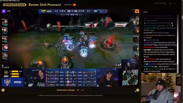 02:20:06Die Kategorie „Bester Skill-Moment“ wird vorgestellt, gesponsert von Mastercard. Clips von Lenly und Basti, Kutscha, Dalu, NNO, Divi und Denzen werden gezeigt. Der Streamer ist verwirrt über Geographie, insbesondere über Argentinien, das er fälschlicherweise mit Skandinavien und Schnee assoziiert, obwohl es in Südamerika liegt und warm ist. Er beschreibt diese Verwirrung als einen „Bruch“ und kann es nicht in seinen Kopf bekommen, dass Argentinien nicht kalt ist. Er schwört, dass dies kein Ragebait ist. Ein Clip von Kutscha, der blind und nackt mit einer Keule einen Elden Ring-Boss besiegt, beeindruckt den Streamer zutiefst. Er bezeichnet dies als „Masterclass“ und findet es skilltechnisch herausragend, da er selbst mit allen Sinnen fast an Elden Ring verzweifelt ist. Trotz weiterer beeindruckender Clips, wie Divis No-Death-Runs in Dark Souls, wählt der Streamer Kutscha als Gewinner, da das blinde Besiegen des Bosses für ihn am respektabelsten ist.