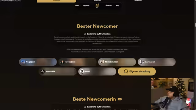 02:36:47Die Kategorie „Bester Newcomer“ wird vorgestellt, basierend auf Statistiken wie Wachstum, Follower-Anstieg und Average Viewer über 24 Monate. Der Streamer erinnert sich an seinen eigenen Gewinn des „Newcomer Awards“ im letzten Jahr, den er als absoluten Traum und das wichtigste Achievement seines Lebens bezeichnet. Er bedankt sich nochmals in aller Form bei seiner Community, da dieser Gewinn trotz vieler politischer Widerstände und Versuche, ihn zu diskreditieren, mit großem Abstand nach Hause geholt wurde. Er ist unglaublich stolz darauf und es kann ihm niemand mehr nehmen. Die Nominierten dieses Jahr sind Frege Paul, Kroko, Niki Stemmler, Marco, Mali und Abdou. Der Streamer entscheidet sich für Kroko, da dieser ein unglaublich unterhaltsamer Streamer ist, seine Zuschauerzahlen immens gesteigert hat (von 1500 auf 5000-7000 Average Viewer) und ein fester Bestandteil von Twitch ist. Er gönnt Kroko den Award von Herzen. In der Kategorie „Beste Newcomerin“ wählt er Rose, da diese ebenfalls extrem „abgefeuert“ hat und sehr unterhaltsam ist.