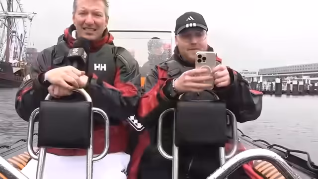 02:51:09Schließlich erreichen sie das Schiff für die geplante Hafentour. Doch die Herausforderungen sind damit nicht beendet, da das Wetter umschlägt und es stark zu regnen beginnt. Sie steigen auf ein leistungsstarkes, offenes Motorboot und legen eine turbulente Tour durch den Hafen und die Förde an, bei der sie vom strömenden Regen nass werden. Die Fahrt wird als aufregend, aber auch als kalt und nass beschrieben, was den Charakter eines typischen Kieler Wochentages unterstreicht.