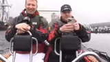 05:08:05Nach dem extremen Erlebnis auf dem Flyboard wechseln die Rollen. Derjenige, der zuvor zögerte, übernimmt die Rolle des Kapitäns und steuert das Boot. Die ersten Versuche sind holprig, doch schnell entwickelt er 'Gefühl' für das Steuer. Es wird eine entspannte gemütliche Fahrt mit 'allzeit sicherer Fahrt', bei der sie die Gegend genießen und den Fans zuwinken. 'Auf hoher See, Baby', wird es genannt.