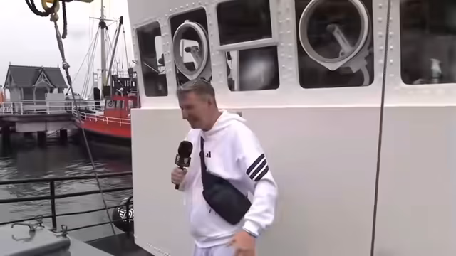 04:01:27Die Stimmung hebt sich, als sie mit einem Frachter die Kieler Förde befahren. Während sie sich als Piraten fantasieren, stoßen sie auf ein beeindruckendes Rettungsschiff, das sogenannte 'Rescue Zone', mit einem riesigen Hubschrauber-Landeplatz. Diese Begegnung wird als 'geistkrank' und 'krass' beschrieben. Die Fahrt selbst wird als 'Rauschelgeschwindigkeit' bezeichnet und wird sehr genossen.