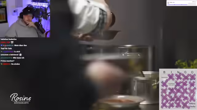 04:35:35Im Stream kocht der Streamer mit Frank Rosin und unterhält den Chat mit verschiedenen Kochtipps. Sie bereiten Zucchinis, Gemüsefond und ein Béchamelsauce zu. Der Streamer probiert diverse Gerichte und gibt positive Rückmeldung zu Franks Können. Dabei entstehen humorvolle Interaktionen mit dem Chat über verschiedene Kochtechniken und Zutaten.