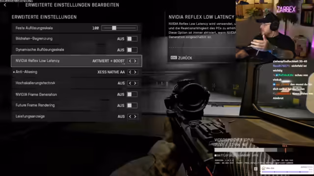 02:36:22Nach einer kurzen Meditationseinheit zur mentalen Stabilisation beginnt das eigentliche Gameplay von Battlefield 6. Der Streamer erklärt den Chat, dass Drops und Gratisskins verfügbar sind, sofern das Twitch-Konto mit dem EA-Konto verknüpft ist. Da er seit langer Zeit keinen Shooter mehr gespielt hat, ist er auf Hilfe der Community angewiesen, um die Meta-Waffen und optimalen Einstellungen zu finden. Der Streamer beginnt nun damit, die Grafik-, Steuerungs- und HUD-Einstellungen des Spiels zu optimieren, um eine Balance aus guter Performance und bestmöglicher visuell Klarheit zu erreichen, vor allem für die Zielhilfe.