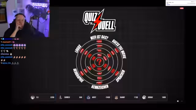 07:55:44Kroko wählt 'Geografie 400' und muss die größte Stadt der Schweiz nennen, was ihm gelingt. Mert wählt 'Kennzeichen 500' und muss das Land zu einem Kennzeichen nennen, was ihm gelingt. Danny wählt 'Guess the Movie 1000' und muss einen Film anhand einer Beschreibung erraten, antwortet aber falsch. Eli kann die Frage richtig beantworten und erhält Punkte. Zabex wählt 'Wer ist das 600' und muss eine Person anhand eines Ausschnitts erkennen, was ihm gelingt. Kroko wählt 'Geografie 600' und muss den nördlichsten Ozean der Erde nennen, antwortet aber falsch. Mert wählt 'Sprachen 800' und muss eine Sprache anhand einer Aufnahme erkennen, antwortet aber falsch. Danny wählt 'Geografie 1000' und muss eine geografische Frage beantworten, was ihm gelingt. Zabex wählt 'Wer ist das 200' und muss eine Person erkennen, was ihm gelingt. Eli wählt 'Geografie 1000' und muss eine geografische Frage beantworten, antwortet aber falsch.