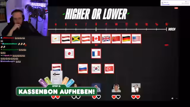09:20:54Zarbex wird durch Montana Black vor dem letzten Platz gerettet und steht vor einer Schätzfrage mit Eli, bei der der erste Platz winkt. Es geht darum, wie viele Länder der Äquator berührt. Der aktuelle Punktestand zeigt ein knappes Rennen zwischen Mert, Eli, Danny, Kroko und Zarbex. Es wird überlegt, ob Kroko durch das Verteilen von Flaggen bevorzugt wird und ob Danny für das Löhnen in Frage kommt. Nach dem Quiz soll 'Higher Lower' gespielt werden, möglicherweise auch im Discord mit Übertragung. Zarbex erklärt, dass er das Spiel erklären muss und dass es um das Einordnen von Kategorien geht. Als erste Kategorie wird Sport vorgeschlagen, genauer gesagt Goldmedaillen bei Olympischen Spielen, wobei die Werte zwischen 0 und 1219 liegen.