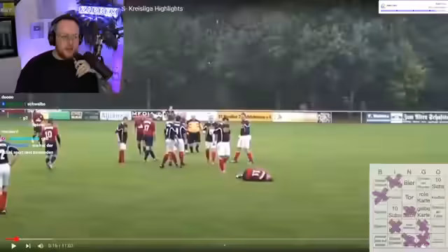 00:30:32Der Streamer äußert seinen Respekt vor den Schiedsrichtern, insbesondere in der Kreisliga, da er selbst nach 20 Minuten Ausdauertraining beim Boxen eine Viertelstunde lang gekotzt habe. Er bewundert, wie die Schiedsrichter es schaffen, 90 Minuten über den Platz zu rennen. Er scherzt, dass er als Schiedsrichter einen Rollator bräuchte. Er bedankt sich bei einem Zuschauer für die Subs und kommentiert, dass es jetzt Stress gibt und eine Keilerei droht. Er freut sich über die Baitfelder und bedankt sich bei weiteren Zuschauern für ihre Unterstützung. Er fragt sich, ob Trainer in der Kreisliga eine rote Karte bekommen können und was dann passiert. Er kommentiert eine Schwalbe und fragt, ob der Schiedsrichter blind oder blöd sei. Er findet es geil, wie der Blaue den Roten schubst und der Rote es nicht mal merkt. Er kommentiert das Alter eines Spielers und scherzt über die Bauchbinde mit dem Alter. Er bedankt sich bei Julia für das Schmieren seines Mikrofonarms und kündigt ein erstes Bingo an.