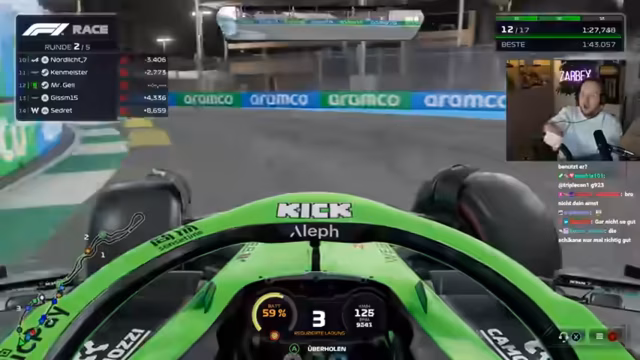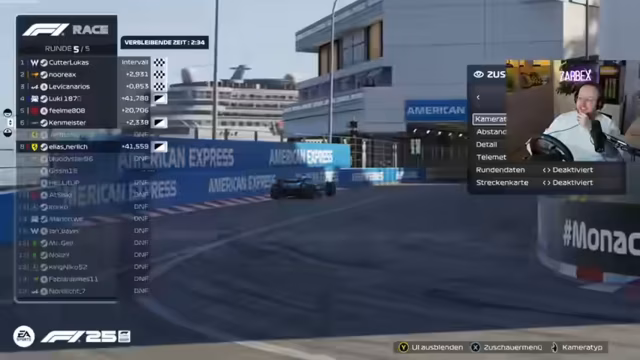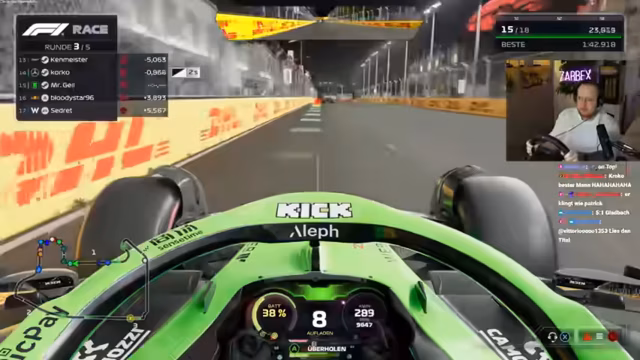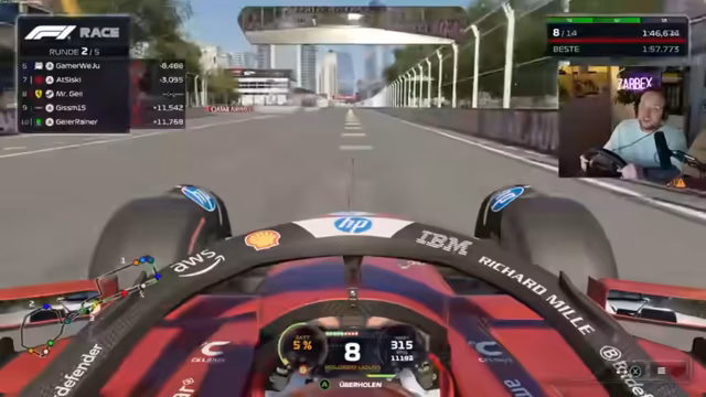 02:59:38Der Stream startet mit dem Formel 1-Rennen in der Lobby, das durch ein Incident mit einem Fahrrad geprägt ist. Die Fahrer reagieren mit Überraschung und Diskussionen über die Positionen und mögliche Punkte. Die Dynamik in der Lobby wird durch humorvolle Konflikte und den Wettbewerbsgeist gezeigt, wobei die Teilnehmer ihre Fahrleistung und Strategien besprechen, um im Rennen voranzukommen.