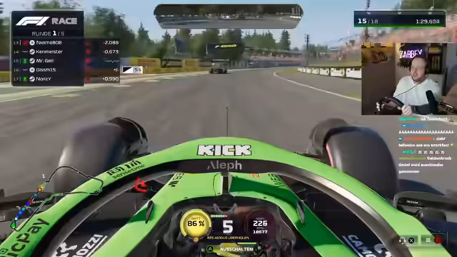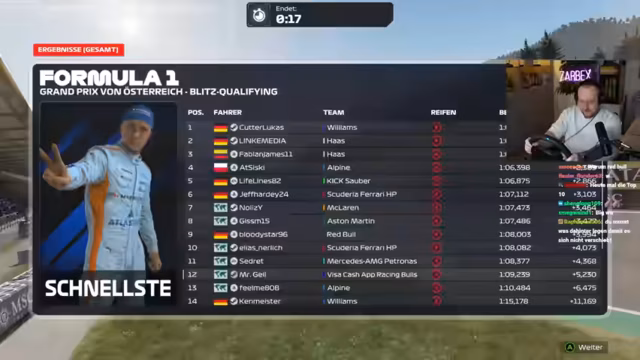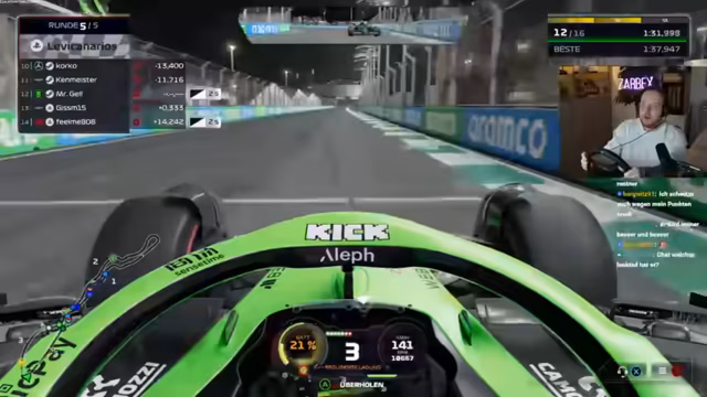 02:08:20Mit einer Mischung aus Nervosität und Vorfreude beginnt das erste Rennen in der Formel 1-Lobby. Die Diskussion drehet sich um den Startvorgang, die korrekte Bedienung der Kupplung und die optimalen Einstellungen. Schnell zeigen sich die Herausforderungen: Some, ungeübte Fahrer verlieren von Anfang an Kontrolle oder verursachen erste Unfälle. Der Chat wird mit den typischen Renngeräuschen gefüttert, während die Fahrer versuchen, sich im Feld zu behaupten.